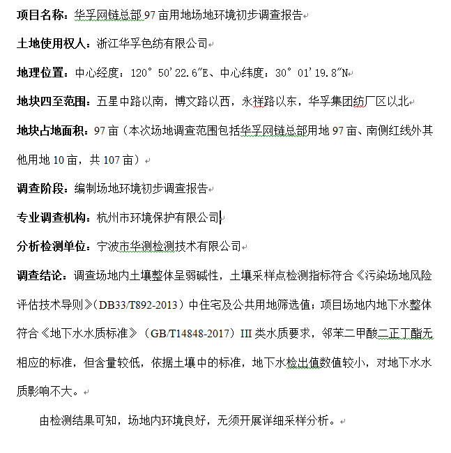 华孚网链总部97亩用地场地环境初步调查报告公示